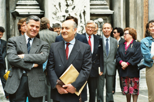 Due persone non identificate durante la presentazione della mostra "Traci. Arte e cultura nelle terre di Bulgaria", nel cortile di Palazzo Ducale, Venezia