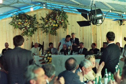 Carlo Bernini al termine del suo intervento durante il pranzo a seguito della celebrazione della Santa Messa di Papa Giovanni Paolo II presso Col Cumano in occasione del suo incontro con la Diocesi e di Belluno - Feltre; alla sua destra il Vescovo di Belluno-Feltre Ducoli Maffeo e Carlo Bernini e il Pontefice