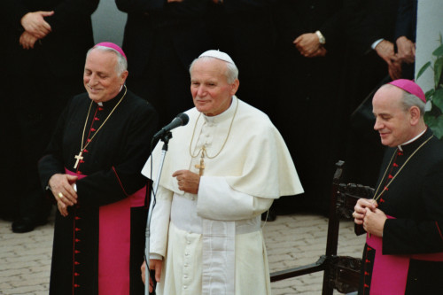 Papa Giovanni Paolo II accompagnato da il Vescovo Ducoli Maffeo (a sinistra) durante l'incontro con i fedeli della Diocesi e di Belluno - Feltre al Centro Papa Luciani