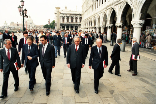 Carlo Bernini, Nereo Laroni e Mirco Marzaro con un gruppo di persone intervenute alla presentazione dell'esposizione della mostra: "Traci. Arte e cultura nelle terre di Bulgaria", nel cortile di Palazzo Ducale, Venezia