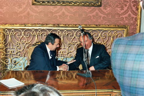 Il Presidente della Regione Veneto Carlo Bernini (a destra) al termine del suo intervento in occasione della visita del Presidente della Repubblica Argentina Raùl Ricardo Alfonsin a Venezia nel 1987