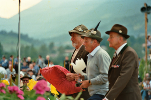 Gli Alpini portano una colomba bianca per la benedizione di Papa Karol Wojtyla durante l'incontro con la diocesi di Belluno - Feltre a Col Cumano