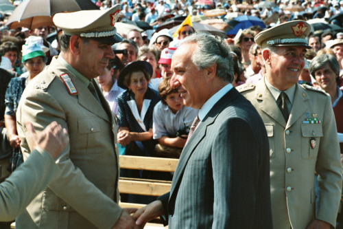 Carlo Bernini, Presidente della Regione Veneto, al centro, saluta un rappresentante del corpo Guardia di Finanza prima all'incontro di Papa Giovanni Paolo II con la Diocesi e di Belluno - Feltre