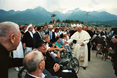 Papa Giovanni Paolo II incontra un gruppo di ammalati giunti a Col Cumano per partecipare all'incontro con la Diocesi e di Belluno - Feltre