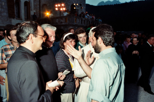 Papa Giovanni Paolo II incontra le persone che si sono riunite presso le mura del castello di Mirabello, dove il Pontecifice avrebbe soggiornato per 9 giorni in occasione del proprio soggiorno estivo nel Cadore.