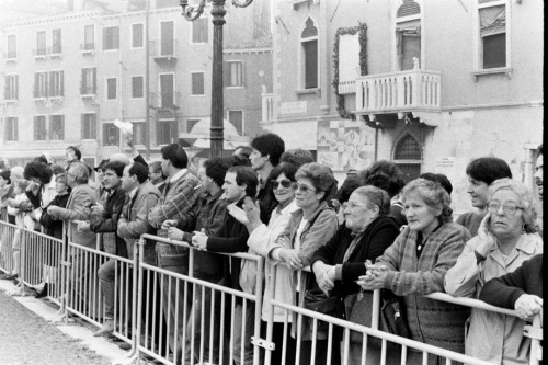 Pubblico assiepato dietro le transenne, in attesa dell'arrivo della Regina Madre_Venezia