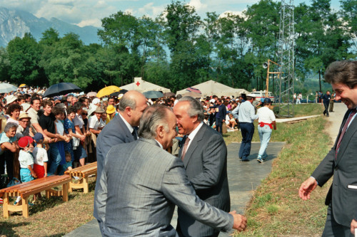 Carlo Bernini ed Umberto Carraro salutano alcune persone al termine dell'incontro con Papa Giovanni Paolo II con la Diocesi e di Belluno - Feltre
