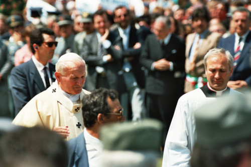 Papa Giovanni Paolo II al termine della celebrazione della Santa Messa presso Col Cumano in occasione del suo incontro con la Diocesi e di Belluno - Feltre