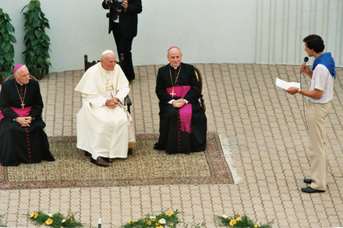 Papa Giovanni Paolo II e il Vescovo Ducoli Maffeo presso l'anfiteatro del Centro Papa Luciani di Santa Giustina in occasione dell'incontro del Pontefice con i fedeli della Diocesi e di Belluno - Feltre
