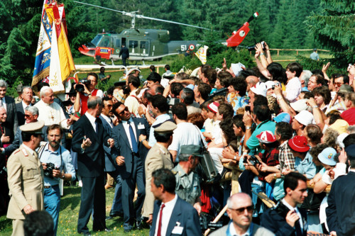 L'arrivo di Papa Giovanni Paolo II e il suo saluto al pubblico di fedeli presso Col Cumano in occasione del suo incontro con la Diocesi e di Belluno - Feltre