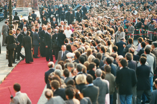 Giovanni Paolo II accompagnato dal Vescovo di Verona Giuseppe Amani tra il pubblico di fedeli riuniti in Piazza Brà in occasione della sua visita pastorale a Verona; tra le autorità civili presenti il Presidente della Regione Veneto Carlo Bernini, il sindaco di Verona Gabriele Sboarina e Carlo Fracanzani
