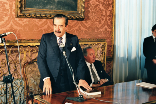 Il Presidente della Repubblica Argentina Raùl Ricardo Alfonsin durante il suo intervento in occasione della visita a Venezia nel 1987