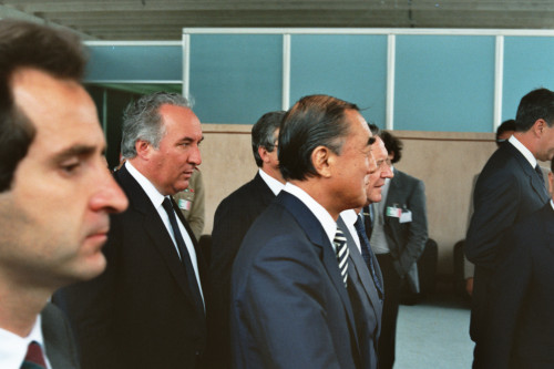 Servizio fotografico ripreso durante l'arrivo di Yasuhiro Nakasone presso l'aeroporto di Tessera, in occasione della sua partecipazione al summit del Gruppo dei Sette, Venezia nel 1987