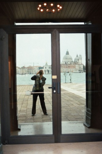 Fotografia del fotografo Elio Ceolin su una porta a vetri, sull'Isola di San Giorgio, Venezia