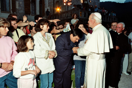 Papa Giovanni Paolo II incontra le persone che si sono riunite presso le mura del castello di Mirabello, dove il Pontecifice avrebbe soggiornato per 9 giorni in occasione del proprio soggiorno estivo nel Cadore.