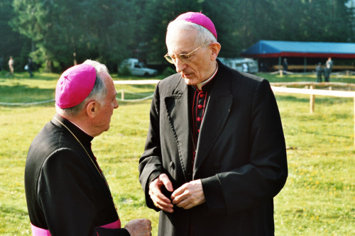 Il Vescovo Ducoli Maffei incontra un altro alto prelato non identificato in attesa dell'arrivo di Papa Giovanni Paolo II in occasione del suo incontro con la Diocesi e di Belluno - Feltre
