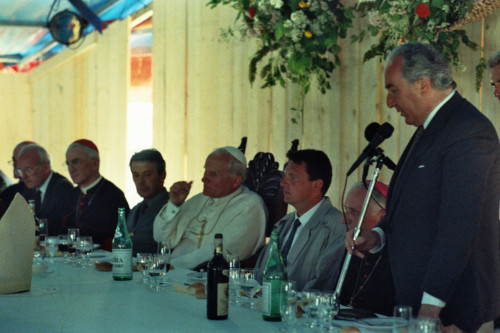 L'intervento di Carlo Bernini durante il pranzo a seguito della celebrazione della Santa Messa di Papa Giovanni Paolo II presso Col Cumano in occasione del suo incontro con la Diocesi e di Belluno - Feltre; alla sua destra il Vescovo di Belluno-Feltre Ducoli Maffeo e Carlo Bernini e il Pontefice
