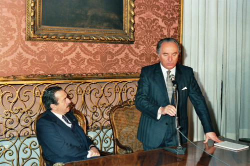 Il Presidente della Repubblica Argentina Raùl Ricardo Alfonsin (a sinistra)in visita a Venezia nel 1987, durante dell'intervento di Carlo Bernini Presidente della Regione Veneto (a destra)