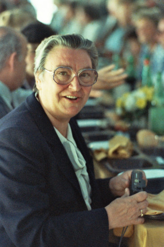 Ritratto femminile tra il pubblico di fedeli presenti alla celebrazione della Santa Messa presso Col Cumano di Papa Giovanni Paolo II in occasione del suo incontro con la Diocesi e di Belluno - Feltre