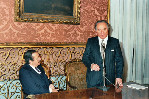 Il Presidente della Repubblica Argentina Raùl Ricardo Alfonsin (a sinistra)in visita a Venezia nel 1987, durante dell'intervento di Carlo Bernini Presidente della Regione Veneto (a destra)
