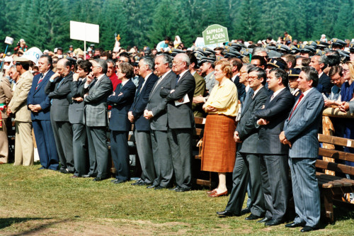 Carlo Bernini (al centro), Umberto Carraro (terzo da sinistra) e Nereo Laroni Sindaco di Venezia (terzo da destra) tra i fedeli e i giornalisti giunti presso Col Cumano in occasione della visita di Papa Giovanni Paolo II