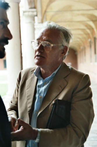 Primo piano di un uomo che sembra discutere all'interno del chiostro del convento di San Giorgio, Venezia