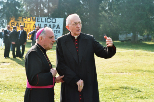 Il Vescovo Ducoli Maffei incontra e discute con un altro alto prelato non identificato in attesa dell'arrivo di Papa Giovanni Paolo II in occasione del suo incontro con la Diocesi e di Belluno - Feltre
