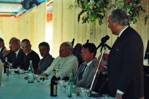 L'intervento di Carlo Bernini durante il pranzo a seguito della celebrazione della Santa Messa di Papa Giovanni Paolo II presso Col Cumano in occasione del suo incontro con la Diocesi e di Belluno - Feltre; alla sua destra il Vescovo di Belluno-Feltre Ducoli Maffeo e Carlo Bernini e il Pontefice