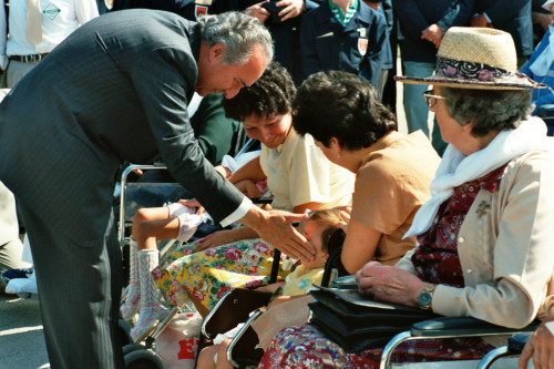 Carlo Bernini saluta un gruppo di ammalati giunti a Col Cumano per partecipare all'incontro di Papa Giovanni Paolo II con la Diocesi e di Belluno - Feltre