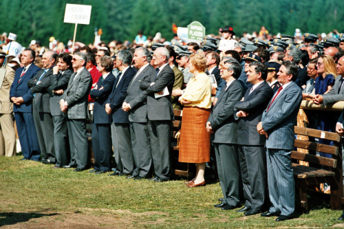 Carlo Bernini (al centro), Umberto Carraro (terzo da sinistra) e Nereo Laroni Sindaco di Venezia (terzo da destra) tra i fedeli e i giornalisti giunti presso Col Cumano in occasione della visita di Papa Giovanni Paolo II