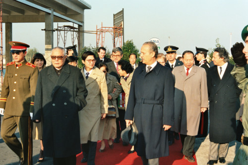 Il Presidente della Repubblica Popolare Cinese Li Xiannan, presso l'aeroporto Marco Polo al termine della sua visita a Venezia; a prendere commiato il Sindaco di Venezia Nereo Laroni (al centro) e il Prefetto Ugo Trotta (il secondo da sinistra)
