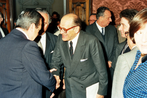 Il Presidente della Repubblica Argentina Raùl Ricardo Alfonsin (a sinistra)in visita a Venezia nel 1987, mentre saluta gli esponenti politici presenti durante il suo intervento a Palazzo Balbi