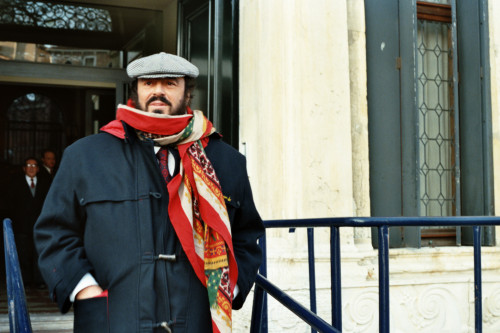 Luciano Pavarotti in primo piano all'uscita di Palazzo Balbi. Secondo scatto