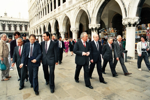 Carlo Bernini, Nereo Laroni e Mirco Marzaro con un gruppo di persone intervenute alla presentazione dell'esposizione della mostra: "Traci. Arte e cultura nelle terre di Bulgaria", nel cortile di Palazzo Ducale, Venezia