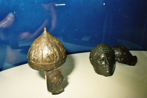 Un elmo e una testa in una sala nell'appartamento del Doge allestista per l'esposizione della mostra: "Traci. Arte e cultura nelle terre di Bulgaria", nel cortile di Palazzo Ducale, Venezia