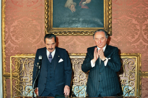 Il Presidente della Repubblica Argentina Raùl Ricardo Alfonsin al terine del suo intervento in occasione della visita a Venezia nel 1987; alla sua sinistra il Presidente della Regione Veneto Carlo Bernini