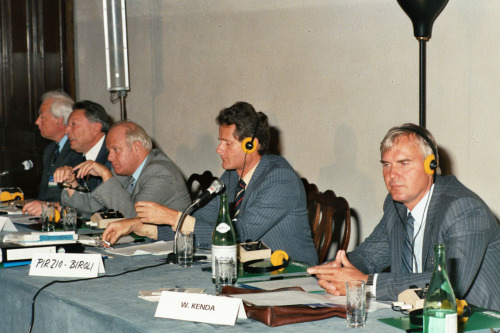 Seduti al tavolo della conferenza da sinistra verso destra si possono riconoscere: un conferenziere; A. Bykov; altro conferenziere;Pirzio - Biroli; W. Kenda