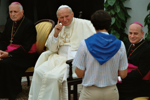 Papa Giovanni Paolo II accompagnato da il Vescovo Ducoli Maffeo (a sinistra) durante l'incontro con i fedeli della Diocesi e di Belluno - Feltre al Centro Papa Luciani