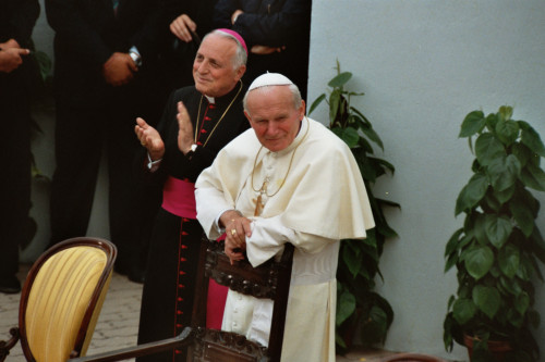 Papa Giovanni Paolo II accompagnato da il Vescovo Ducoli Maffeo (a sinistra) durante l'incontro con i fedeli della Diocesi e di Belluno - Feltre al Centro Papa Luciani
