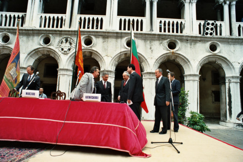 Alcuni uomini della segreteria di Carlo Bernini accompagnano un esponente politico bulgaro non ancora identificato "Traci. Arte e cultura nelle terre di Bulgaria", nel cortile di Palazzo Ducale, Venezia
