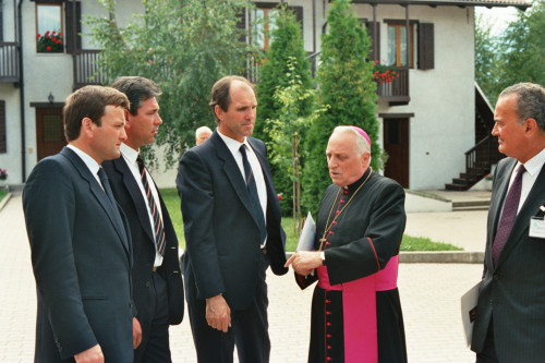 Vescovo Ducoli Maffeo presso il Centro Papa Luciani a Santa Giustina, organizza con alcune persone la visita di Papa Giovanni Paolo II