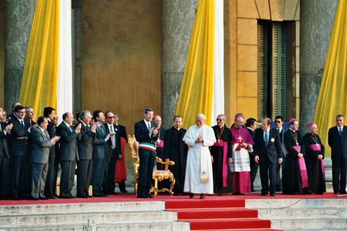 Papa Giovanni Paolo II, saluta il pubblico di fedeli, accanto alle autorità civili riunitisi presso Palazzo Barbieri in occasione della sua visita a Verona;