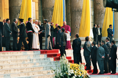 Papa Giovanni Paolo II al termine del suo intervento, saluta le autorità militari locali riunite in occasione della sua visita alla città di Verona; tra le autorità presenti ricordiamo Carlo Bernini Presidente della Regione Veneto, il Vescovo di Verona Giuseppe Amani, il sindaco della città Gabiele Sboarina e Carlo Fracanzani