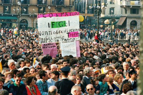 Un manifesto di protesta che dice "E' colpa tua: i figli non ti obbediscono perchè hanno troppi soldi in tasca" mostrato in Piazza Brà in occasione della visita pastolare di Papa Giovanni Paolo II