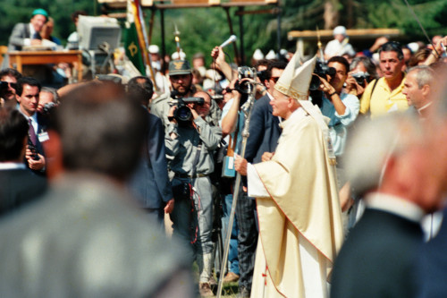 Papa Giovanni Paolo II tra i fedeli e i giornalisti giunti presso Col Cumano in occasione del suo incontro con la Diocesi e di Belluno - Feltre