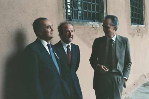 Fotografia di tre uomini che discutono appoggiati al muro del chiostro del convento di San Giorgio, Venezia