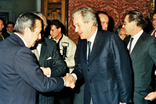 Il Presidente della Repubblica Argentina Raùl Ricardo Alfonsin (a sinistra)in visita a Venezia nel 1987, mentre saluta gli esponenti politici presenti durante il suo intervento a Palazzo Balbi