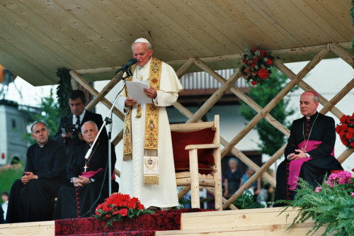 Papa Karol Wojtyla durante il suo discorso in occasione dell'incontro con la diocesi di Belluno - Feltre a Col Cumano; alle sue spalle il Vescovo Ducoli Maffeo