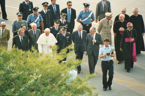 Papa Giovanni Paolo II giunto all'aeroporto di Istrana da Lorenzago di Cadore con l'elicottero dell'aeronautica militare al termine delle vacanze estive passate in Cadore, da qui il Papa sarebbe salito sul jet per Roma
