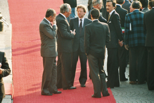 Carlo Bernini, saluta il pubblico accompagnato da Giovanni Lanna e alcuni uomini della sua segreteria in piazza Brà a Verona in occasione della visita pastorale di Papa Giovanni Paolo II